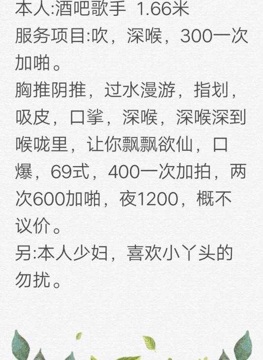 熟女类型的大姐姐,价格就三张全套,还是相当亲民的,姿势随意玩的也开,想怎么玩都行,泻火必去的地方。 ...