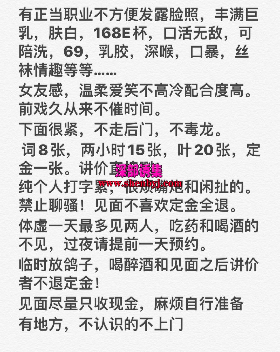 温柔体贴活好不事,会玩各种姿势,服务耐心,配合度高,全程听指挥,不催不事,本人比照片漂亮性价比很高, ...